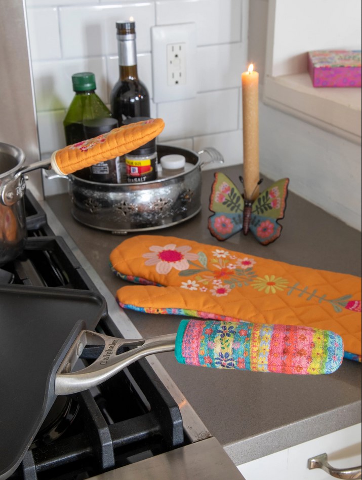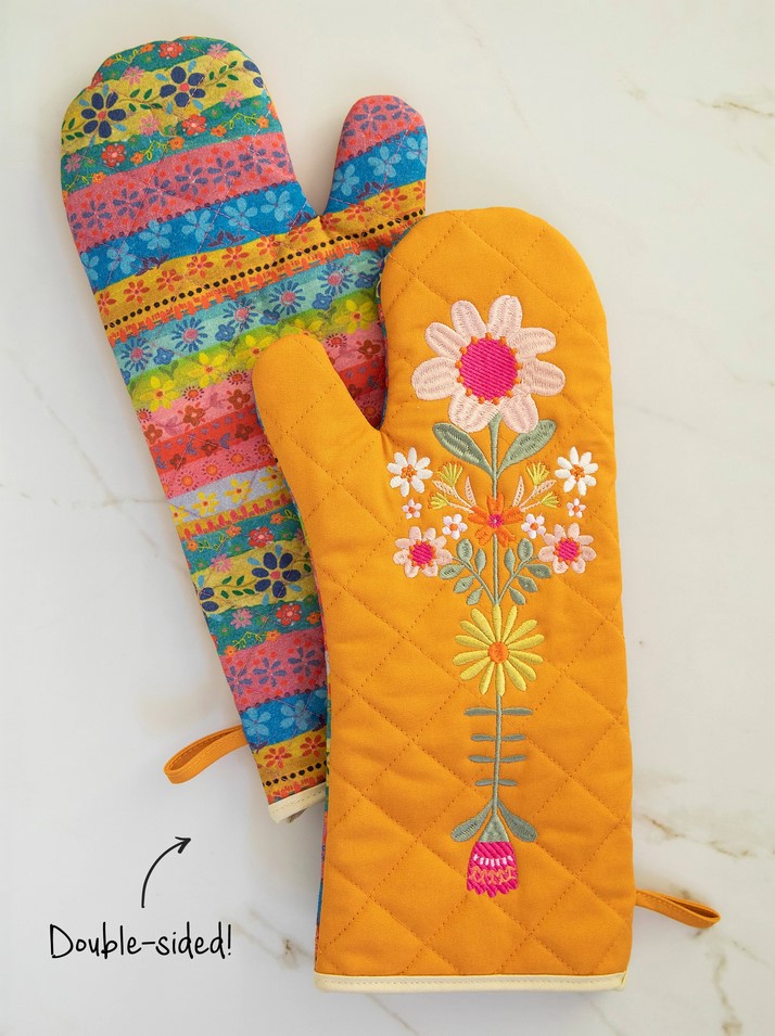 Oven mitts are a kitchen necessity, but we prefer them to have some personality! With oven mitts this cute, you’ll always want to be baking! Not only are the tops of the mitts embroidered with a fun floral design, but they’re practical too! We’ve made them extra-long so you can grab that big pizza pan or giant cookie sheet with confidence. Make the bakers on your gift list SO happy! Our Oven Mitts also make the perfect housewarming or hostess gift, along with our Pot Holders. Everyone should bake happy! • Material: Cotton• Machine Wash Cold Delicate, Do Not Bleach, Tumble Dry Low, Do Not Iron• Dimensions: 38,1 cm(L) x 15,24 cm(W)