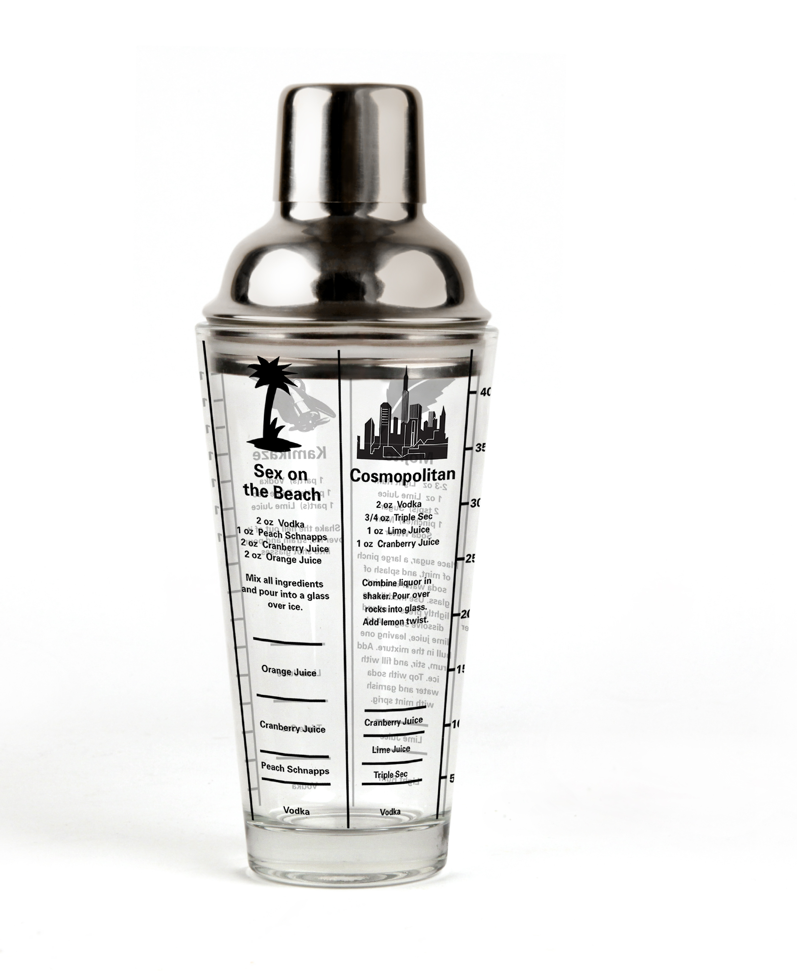 Fancy yourself a bartender? The Mix Master Cocktail Shaker has recipes and pour markings for six classic cocktails, making it easy to prepare perfect drinks. Includes recipes for: White Russian, Sex on the Beach, Cosmopolitan, Long Island Iced Tea, Mojito and Kamikaze.• Capacity: 470 ml