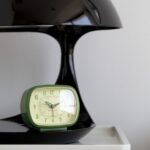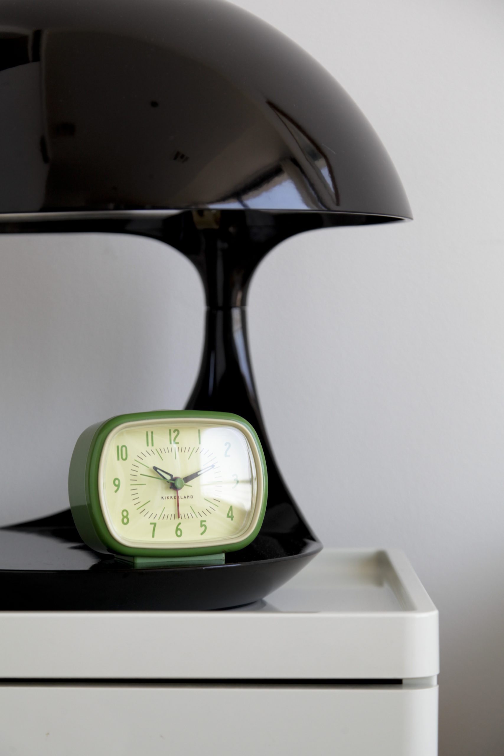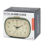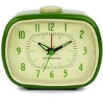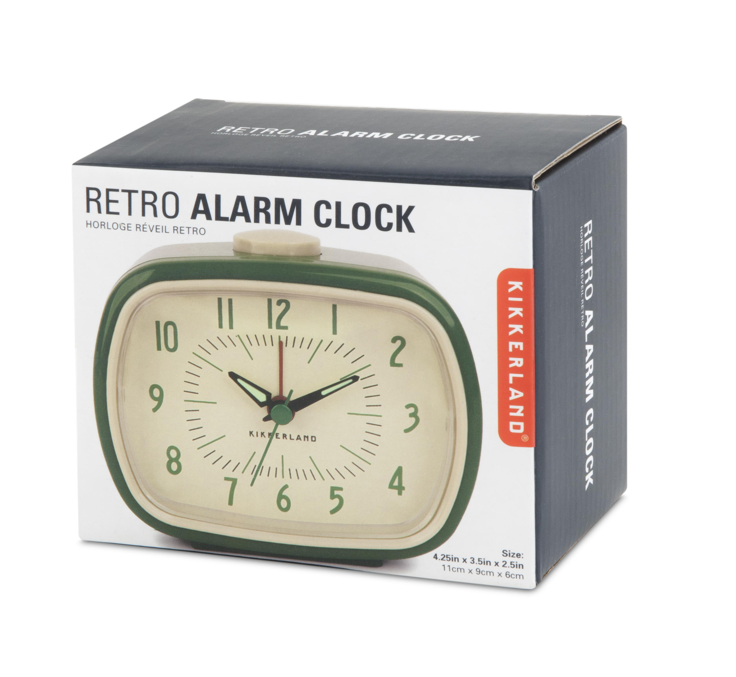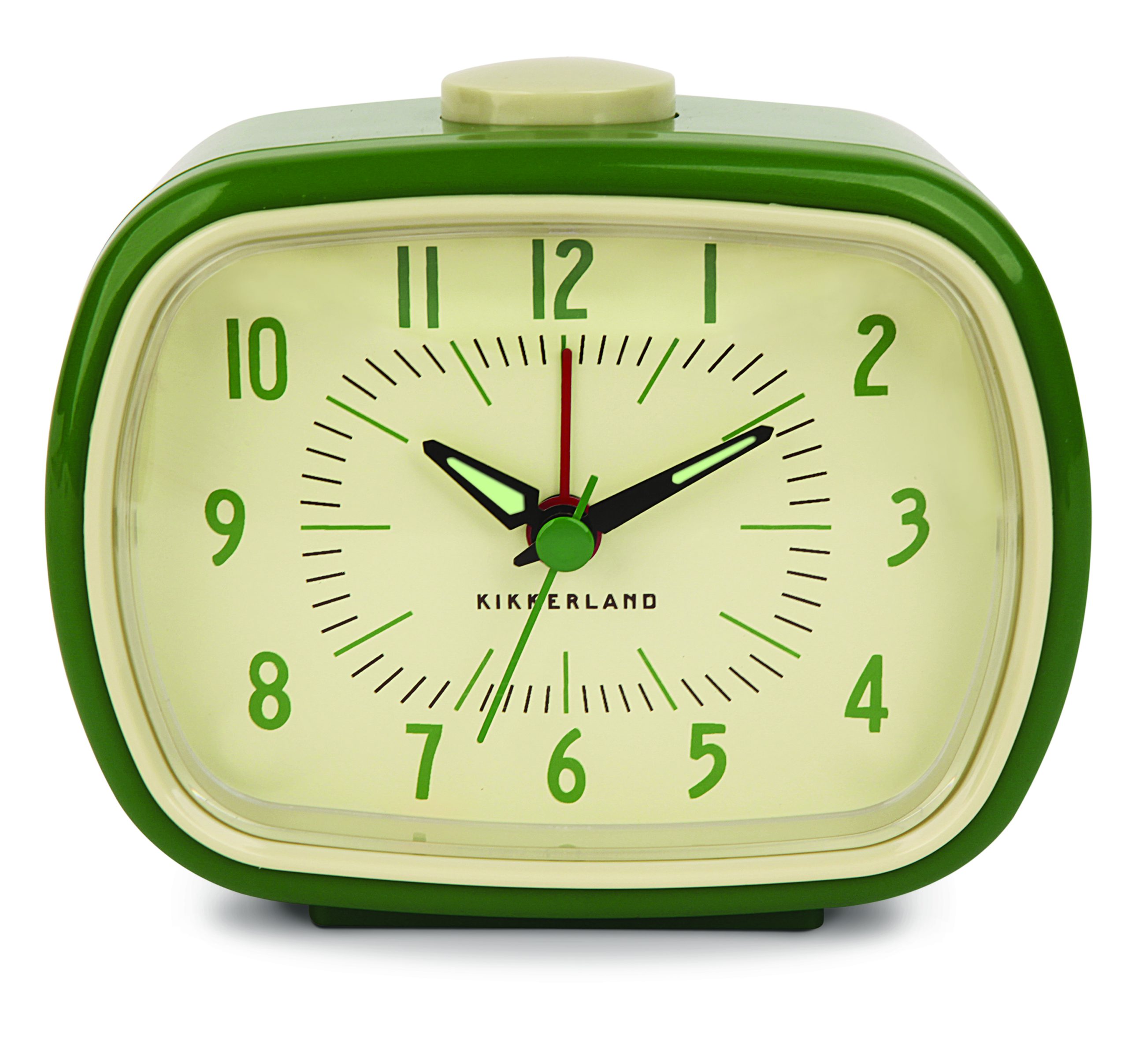 Vintage inspired alarm clock-Green plastic case and numbers with an ivory face and glow in the dark hands-Top shut off button for beep alarm-Requires 1 AA battery (not included)• Material: ABS, CLOCKWORKS• Glow in the dark face and a beeping alarm• Dimensions: 10,8 x 8,9 x 5,7 cm