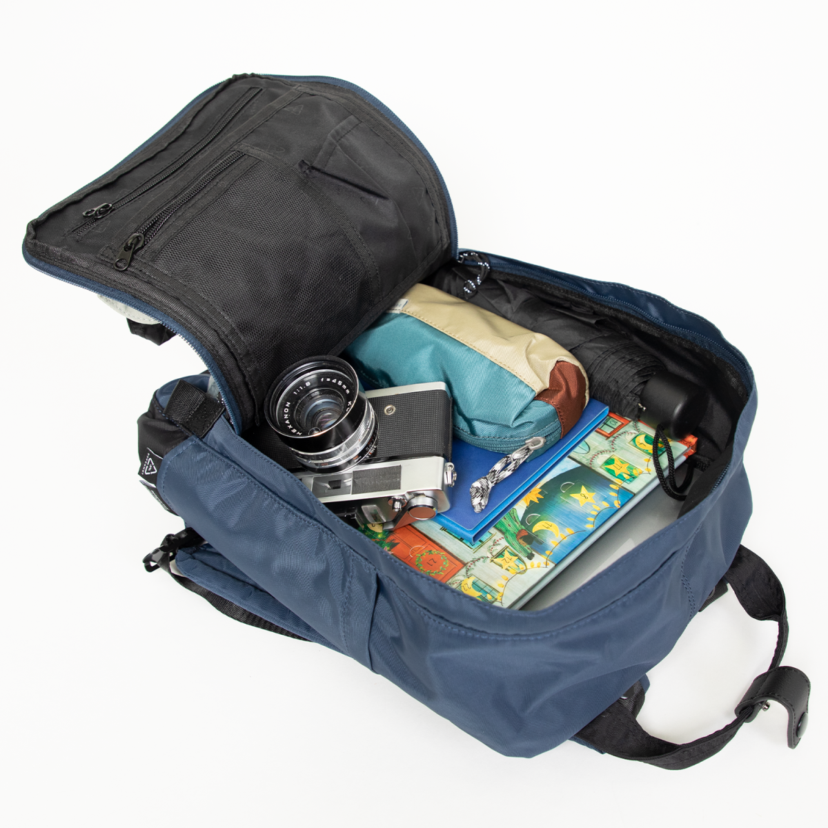 • Full width zippered main compartment• Front flip-open pocket secure with snap button• Two side slip pockets• Internal padded compartment fits 14” laptop• Internal slip pocket and zippered pocket to organize essentials• Internal slip pocket for water bottle and umbrella• Real leather trimming• Top loading handle• Padded adjustable backpack strap• Material 420D Nylon• Size 28cm x 11cm x 38cm• Capacity 16L