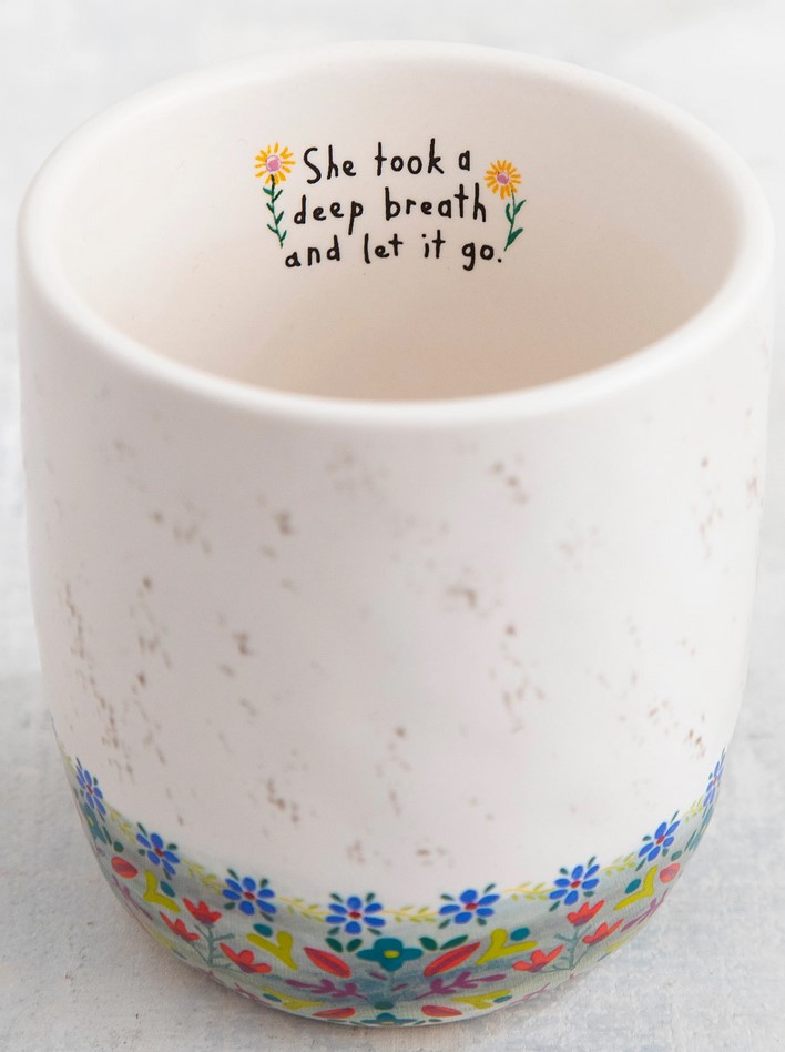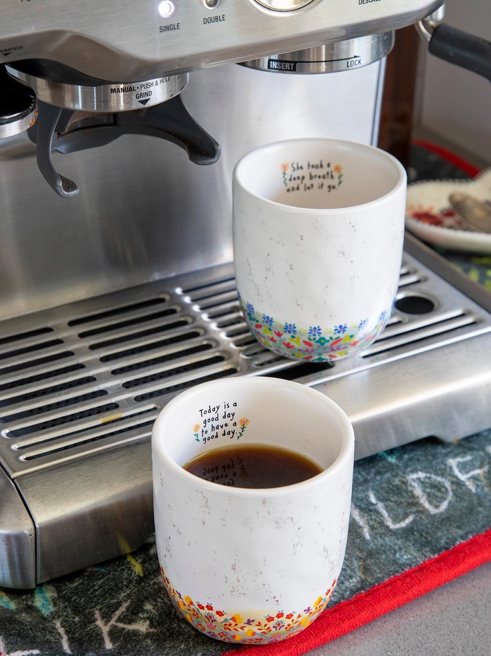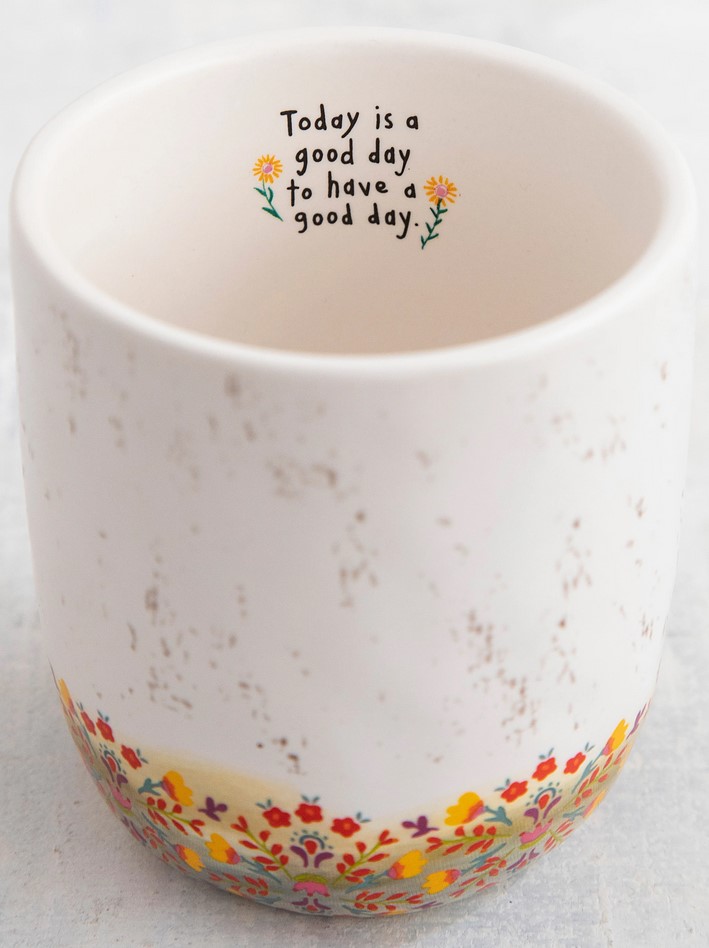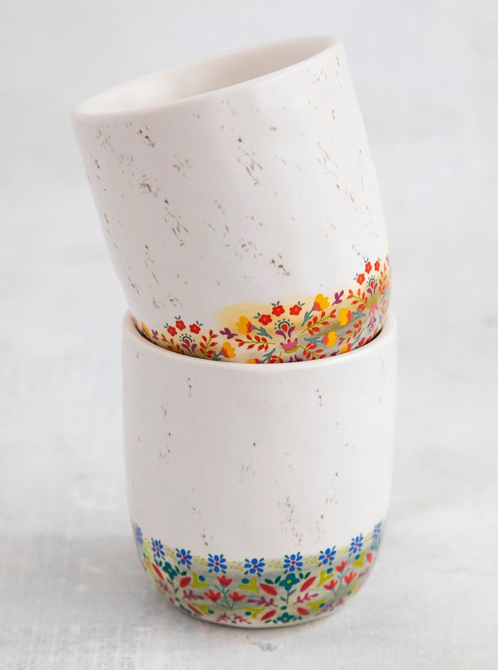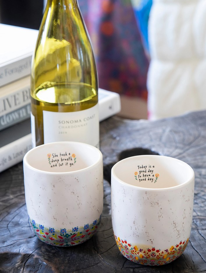 The cutest Set of 2 Tumbler Mugs ever! We love the hand-crafted look that they give! They feature a beautiful floral rim around the bottom and a sweet sentiment inside to remind you to live happy! They’re perfect for wine, tea or your morning coffee! They also make the best gift for the hostess or someone you love!• Material: Ceramic• Dimensions: 8,89(H) x 8,25 cm diameter• Dishwasher And Microwave Safe• Set of 2 hand molded mugs include sentiment printed on inside rim. Mugs may become hot in microwave. Please use caution while handling• Capacity: 295ml