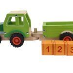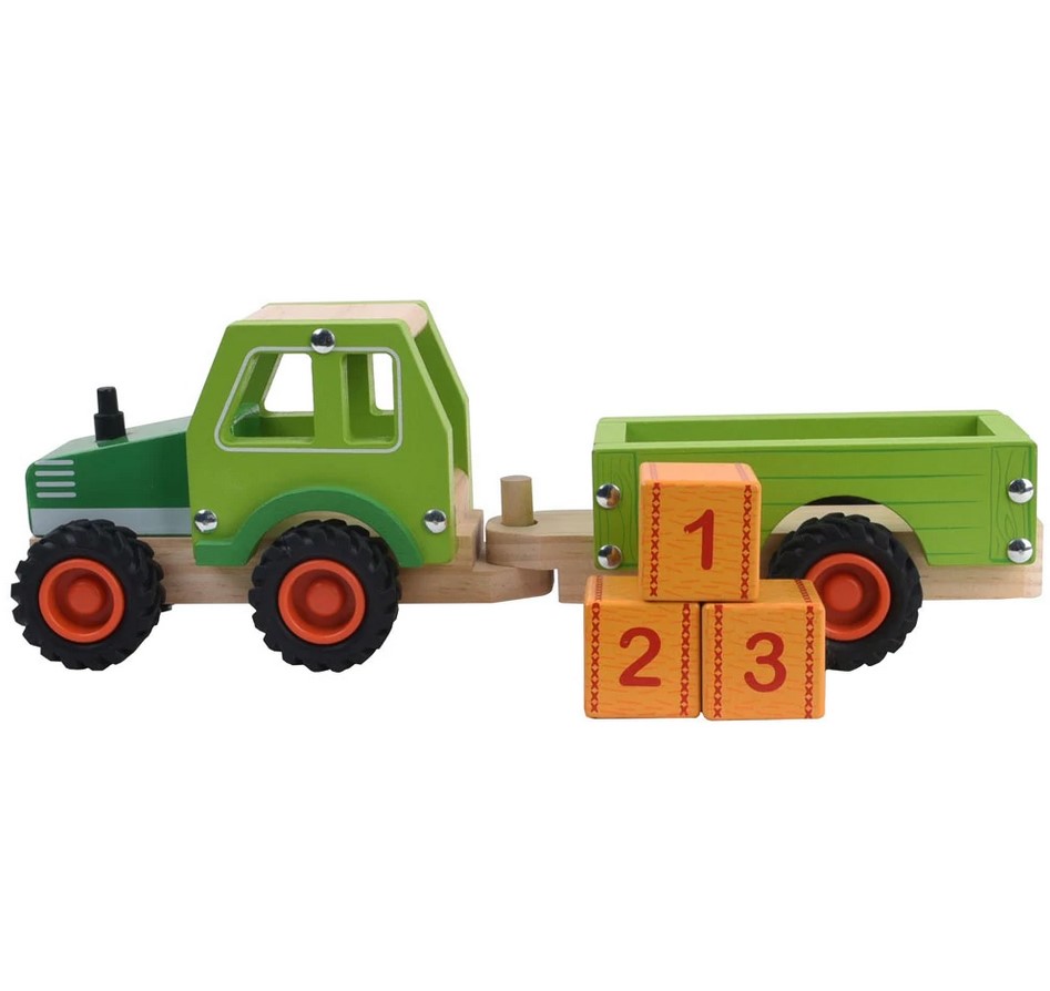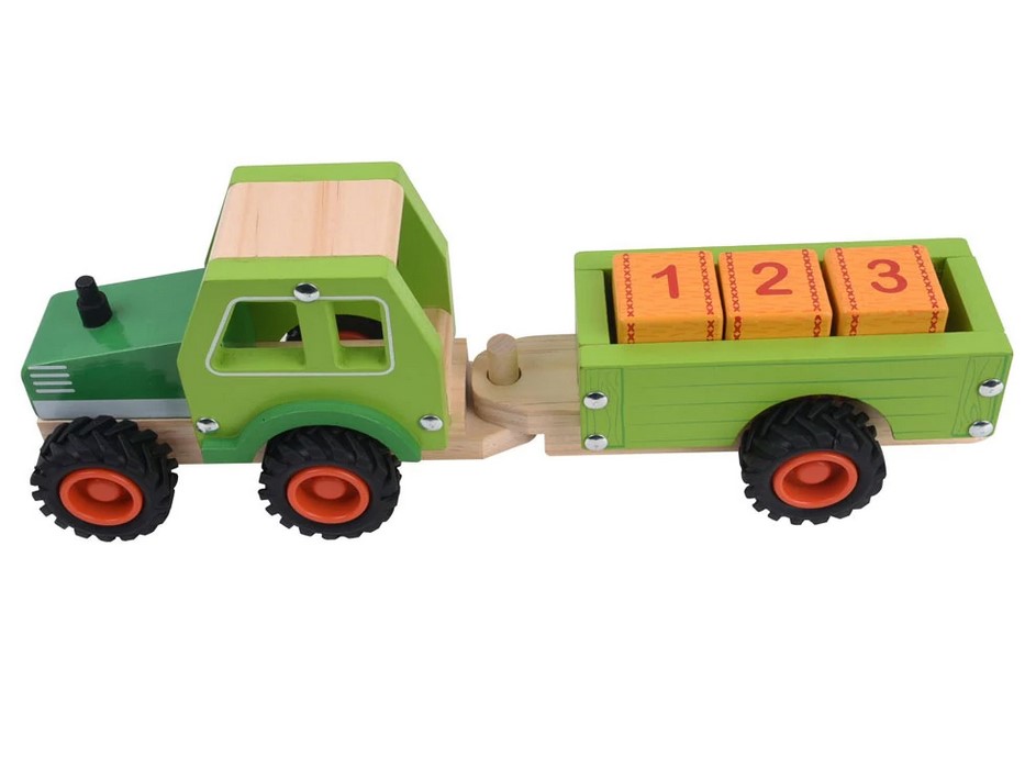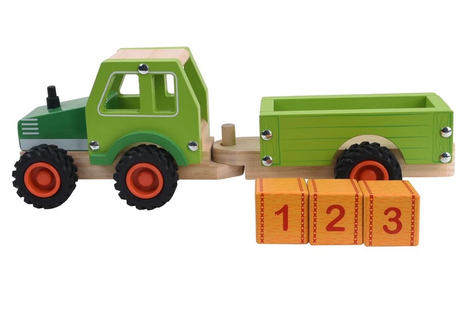 This Tractor and trailer is sure to be a hit with three removable hay bales that fit snugly on to the back of the smooth rolling trailer.The Tractor and Trailer are very robust, solidly built and durable. The bales are numbered to help with number recognition. Made from ethically sourced 100% natural wood, this is a beautiful hard-wearing toy. A perfect toddler-proof gift!• Dimensions: 29,5 x 10 x 9 cm