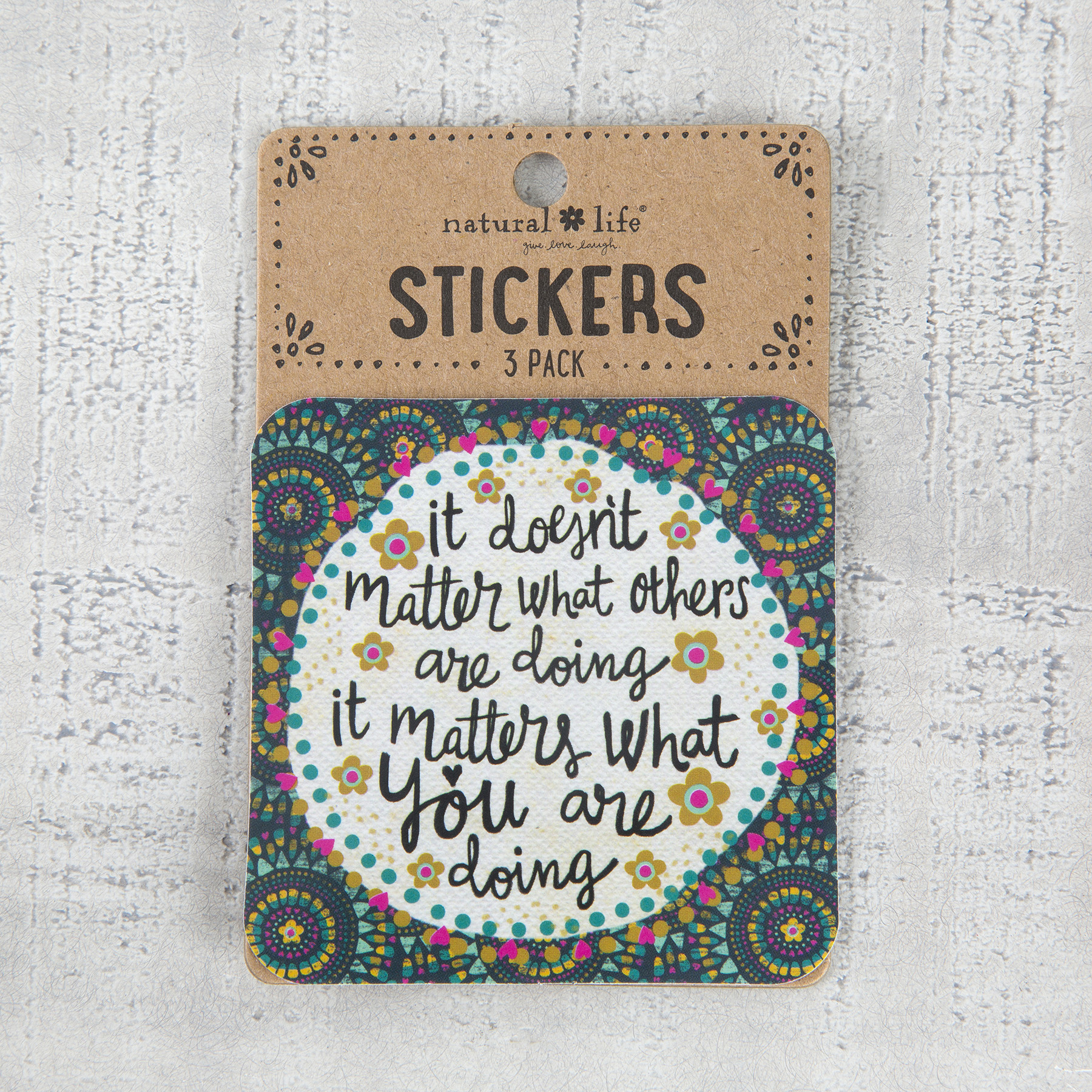 Σημασία δεν έχει τί κάνουν οι άλλοι αλλά τί κάνεις εσύ! Τρία αυτοκόλλητα με το ίδιο υπέροχο εικαστικό και αυτό το εμπνευστικό μήνυμα που χαρίζουν ζωντάνια και χρώμα σε κάθε τετράδιο αλλά και σε κάθε αντικείμενο. Το λαπτοπ σου, το γραφείο σου κι οποιαδήποτε άλλη επιφάνεια μεταμορφώνεται με τα ξεχωριστά αυτοκόλλητα της σειράς και τα μοναδικά τους μηνύματα.