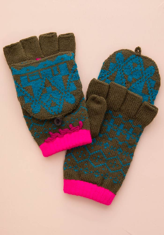 Με τον πιο όμορφο συνδυασμό χρωμάτων κι ένα ιδιαίτερο γεωμετρικλό μοτίβο, χειροποίητα και ζεστά, αυτά τα γάντια σου προσφέρουν ζεστασιά και στιλ. Χωρίς δάχτυλα (για να μπορείς να στέλνεις και τα μηνύματά σου) αλλά με δυνατότητα να τα καλύψεις με το "έξυπνο" κάλυμμα που δένει με κουμπί. Γιατί πώς αλλιώς θα φτιάξεις χιονάνθρωπο; Μήπως ανυπομονείς να πιάσουν τα κρύα;