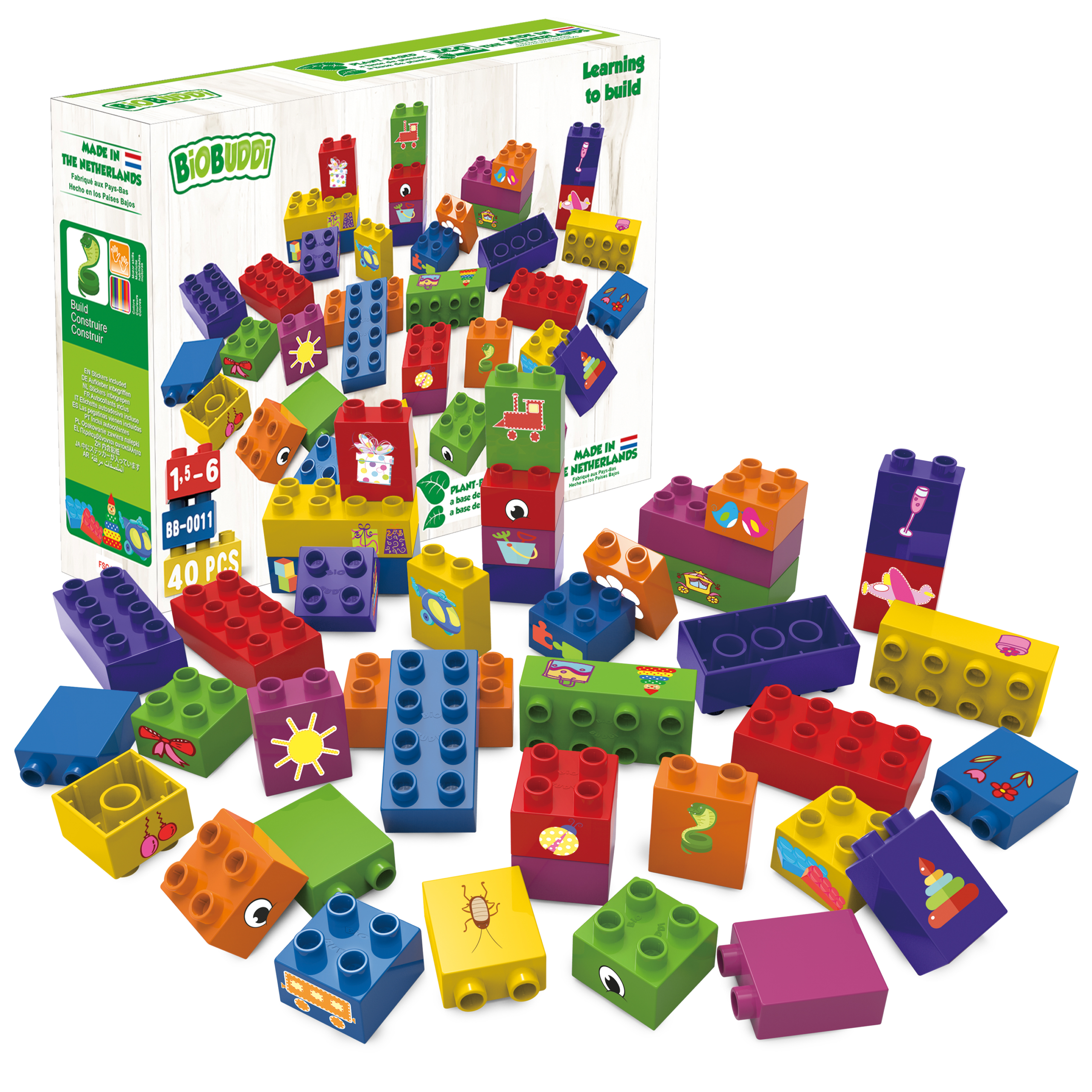 Αυτό το δημιουργικό σετ αποτελείται από 40 οικολογικά τουβλάκια διαφόρων σχημάτων και μεγεθών που βοηθούν τα παιδιά να εξασκήσουν τη δημιουργικότητά τους και τα ενθαρρύνουν να αναπτύξουν κινητικές δεξιότητες. Τα αυτοκόλλητα σε πολλά από τα τουβλάκια απεικονίζουν καθημερινά αντικείμενα, οχήματα και ζωάκια για ακόμα περισσότερη έμπνευση. Πολύχρωμα, σε διαφορετικά σχήματα και συμβατά με τα περισσότερα mega blocks της αγοράς, τα Biobuddi ενεργοποιούν τη φαντασία των παιδιών και τους χαρίζουν άπειρες ώρες παιχνιδιού για πολλά χρόνια.