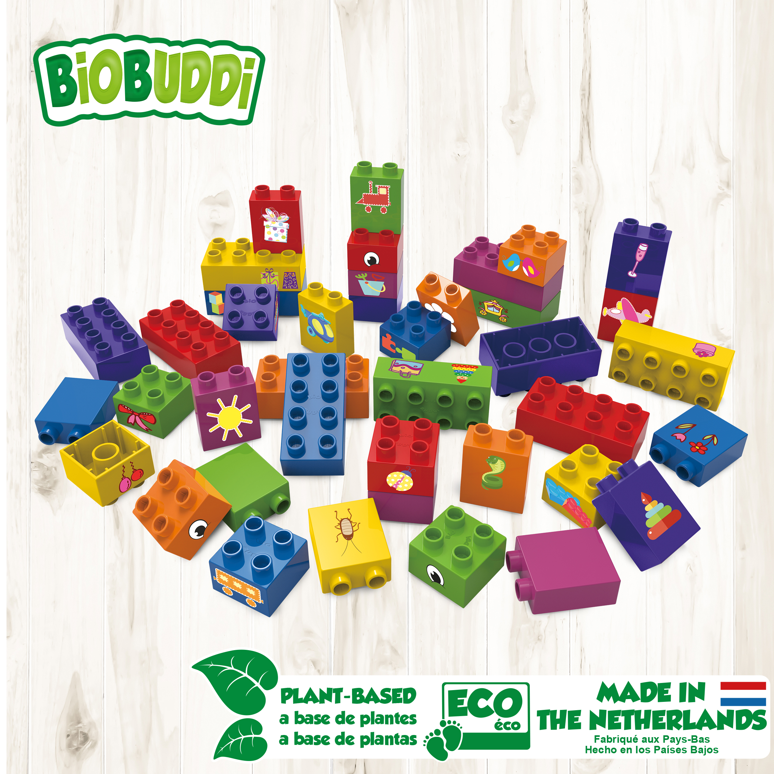Τα τουβλάκια Biobuddi κατασκευάζονται από υπολείμματα φυτών ζαχαροκάλαμου που παράγονται στην Ολλανδία. Είναι φιλικά προς το περιβάλλον, βιώσιμα, ανακυκλώσιμα και ειδικά σχεδιασμένα για μικρά παιδιά. Τα παιδιά μπορούν να συνδυάσουν τα πολύχρωμα τουβλάκια και με άλλου είδους mega blocks για να ζωντανέψουν τη φαντασία τους εξασκώντας έτσι δημιουργικές τους δεξιότητες, όπως μάθηση χρωμάτων, σχημάτων και πολλά άλλα.