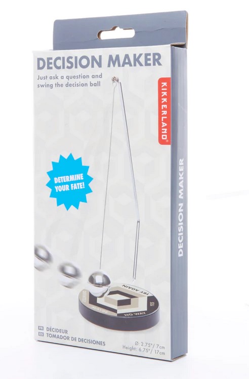 Πρέπει να πάρεις μία απόφαση, αλλά δεν ξέρεις τι να επιλέξεις; Θέλεις να μάθεις αν αυτό που ονειρεύεσαι θα γίνει και δεν ξέρεις ποιον να ρωτήσεις; Είναι απλό! Κάνε μία ερώτηση στο παιχνίδι απόφασης και μάθε αμέσως την απάντηση! Πρόσεξε όμως τι ερώτηση θα κάνεις. Το παιχνίδι απόφασης λειτουργεί στ' αλήθεια. Έχεις το θάρρος να γυρίσεις την μπίλια;• Διαστάσεις προϊόντος (βάση): 7 x 7 x 1 εκ.• Υλικό: Θερμοπλαστικό, Ατσάλι