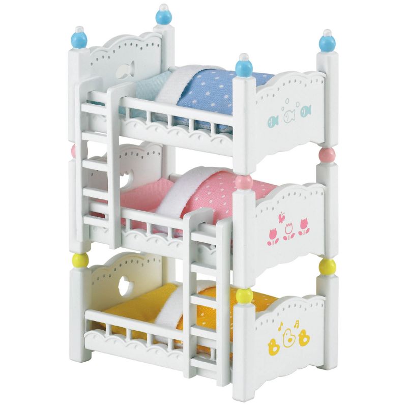 Ποιος είπε ότι στους δυο τρίτος δεν χωράει; Αυτή η τριπλή κουκέτα είναι ότι χρειάζεστε για τα μικρά σας! Αυτά τα υπέροχα λευκά κρεβάτια έρχονται κάθε ένα με ένα στρώμα και κλινοσκεπάσματα για έναν απολαυστικό ύπνο. Κάθε κρεβάτι διαθέτει διαφορετικό χρώμα παπλώματος σε ροζ, κίτρινο και μπλε πουά. Μπορείτε να κοιμίσετε τα μωρά σας δίπλα-δίπλα ή να τοποθετήσετε τα κρεβάτια το ένα πάνω στο άλλο ως μια αυτοσχέδια κουκέτα. Είτε έτσι είτε αλλιώς το να μοιράζεσαι το ίδιο δωμάτιο με τα αδέρφια σου είναι σίγουρα διασκεδαστικό!